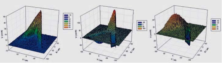 On reducing the pressure, an increase in frequency is observed for “freely” vibrating samples due to the reduction in air damping acting on the sample. Further vibrational modes can also be seen in addition to the expected higher-order harmonics. This result would be more difficult to observe with a single-point vibrometer. When compared to physically scanning the sample, laser scanning can save time for smaller devices, and can also reduce the effects of lateral motion and backlash of the scanning stages. A complete scan of the out-of-plane motion can be obtained in several minutes dependent on the spatial resolution and frequency range required.