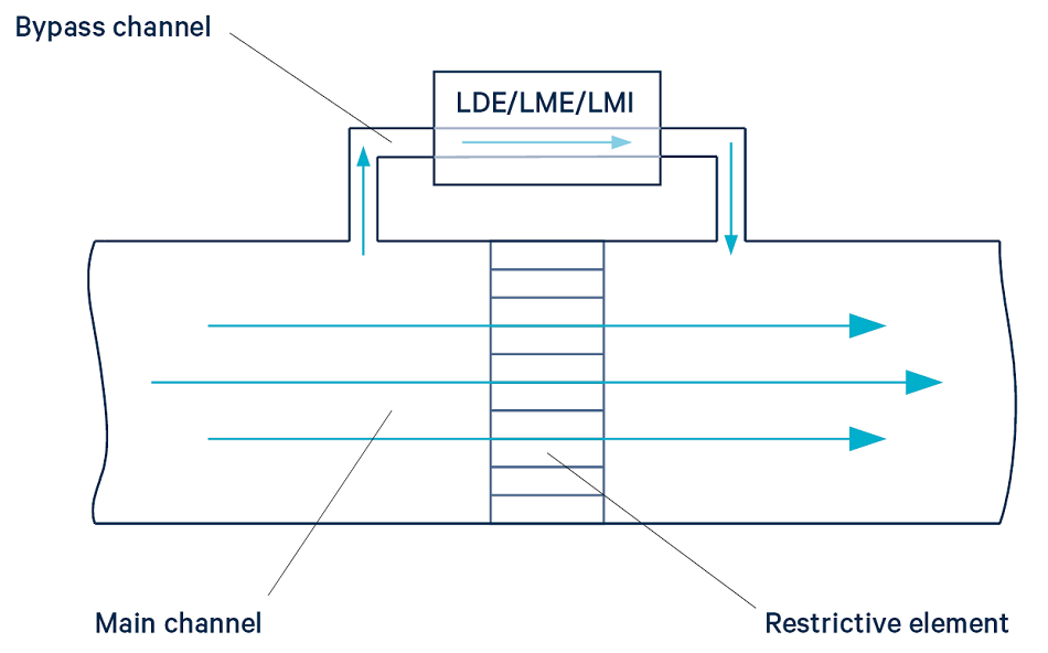 When measuring gas velocity or flow rate, it is advantageous to connect a sensor in a “bypass configuration”; in which high impedance of the sensor results in minimal interference with the main flow.6 The LDE/ LME and LMI sensor series is applicable to a huge range of applications thanks to their versatility and performance, including HVAC, medicine (respirators, anesthesia devices, etc.), and leakage measurement.