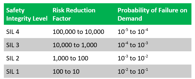 A risk reduction factor (RRF) is determined and an SIS/SIL need is calculated if there is still an unacceptably high level of risk. The RRF is the inverse of the Probability of Failure on Demand for the SIF/SIS, as seen in the table.