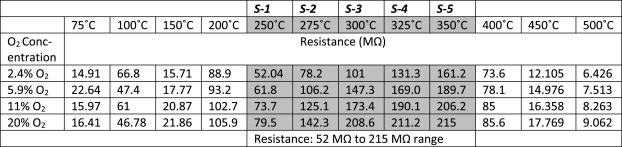 Figure 8 shows the sensor resistance with O2 flow as a function of sensor operating temperature for all the measured O2 concentrations. The corresponding resistance data is depicted in Table 1.