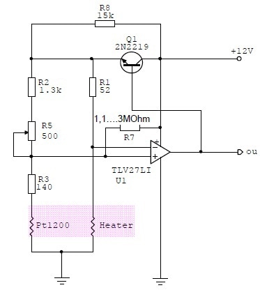 The schematic below shows a simple feedback circuit for temperature regulation of flow sensors heater. The temperature sensor Pt1200 on chip compensates the medium temperature variation.
