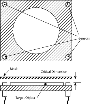Masks that are used in semiconductor processing must be aligned accurately to achieve today's circuit densities. Four non-contact probes can be mounted to monitor z-height and parallelism of the mask relative to the wafer. Parallelism is provided by maintaining equal outputs from the sensors while the actual output value indicates the critical gap dimension. Figure 3 shows mask alignment.