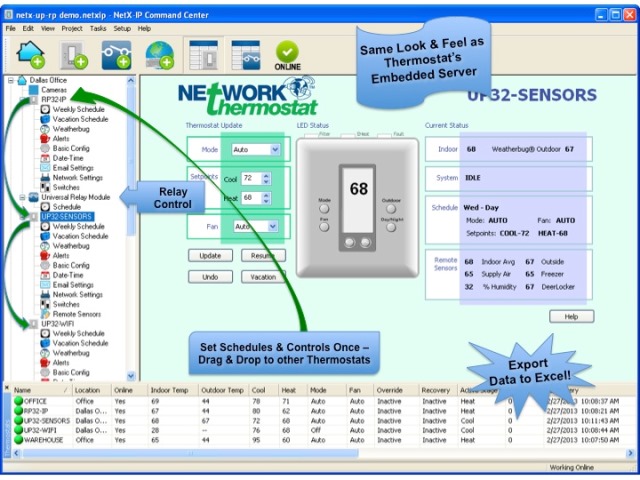 The Command Center features drag and drop updates across multiple thermostats with duplicate information for anything from schedules to alert settings to lockout and override parameters. The Command Center also makes it simple to set global schedules, vacations, overrides and sync thermostat clocks. The software even data logs all the useful data from the thermostats as frequently as every 10 seconds, providing all the relevant information needed for sophisticated spreadsheet and graphical analysis.