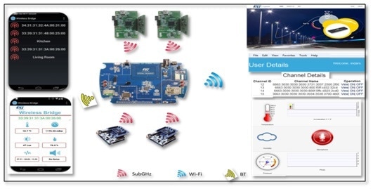 The communication between the Things and Gateway is based on Sub-GHz using SPIRIT1 module on 6LoWPAN networks. The SPIRIT1 modules are fully integrated and ultra-low power RF modules that respectively operate in the 915 MHz/868 MHz ISM bands.