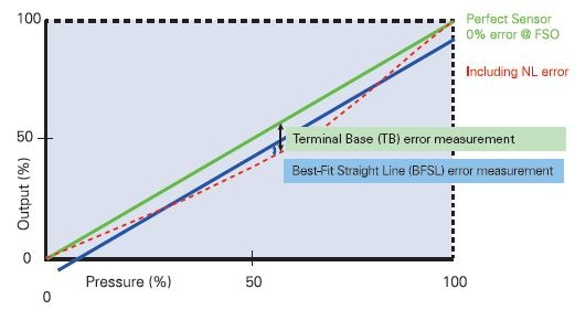 The signal error is directly affected by linearity. Depending on the MEMS signal characteristics, it can be compensated easily if the final accuracy is tight. Generally, the non-linearity error is usually less than 0.2% at the midpoint of the pressure range based on Best Fit Straight Line (see Figure 2). The non-linearity error can be compensated to achieve better than 0.2% by introducing a third pressure point.