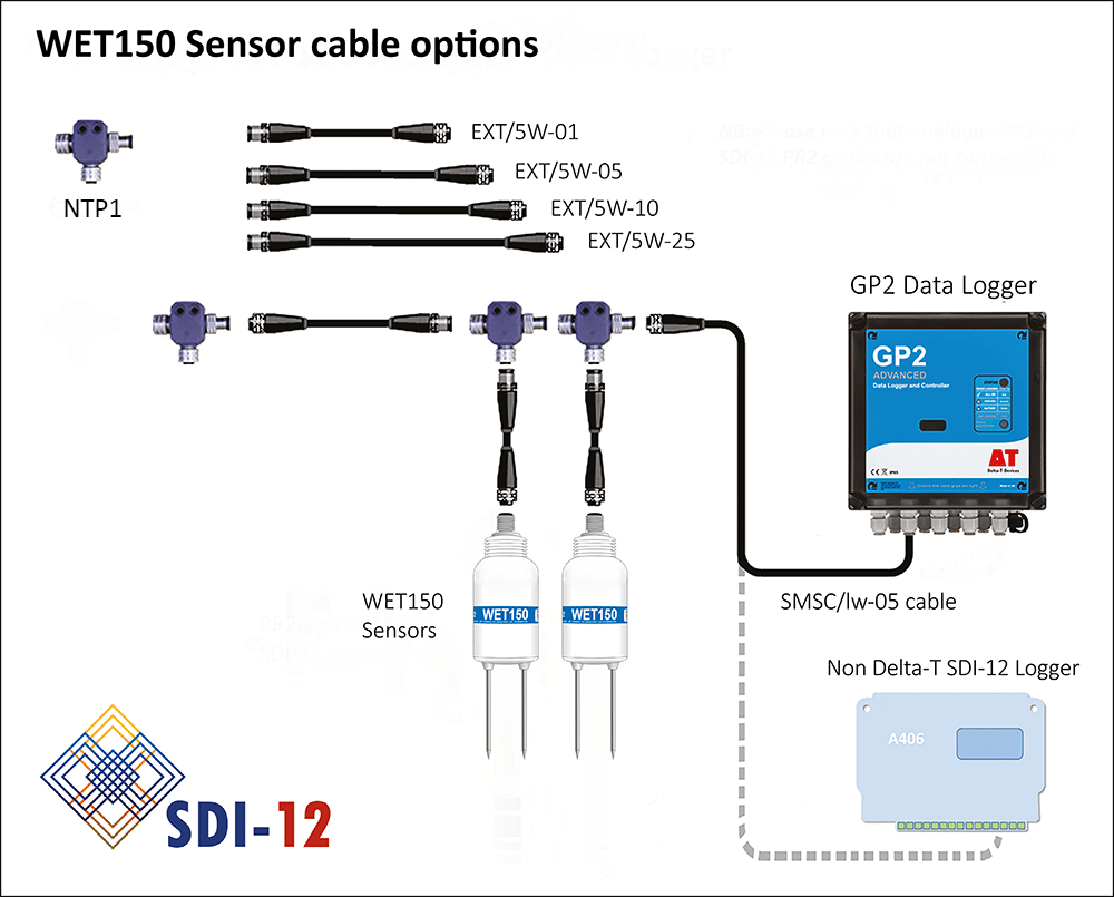 Thanks to the flexibility of the GP2 Logger and the SD1-12 interface, numerous power and cabling configurations can be made when constructing a sensor network. For more data, customers can refer to the WET150 User Manual. Alternatively, they can contact Delta-T Devices to discuss their applications in more detail.
