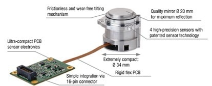 The FSM3000 tilting mirrors are easy to install mechanically and electrically. In addition to its tiny size and light weight, the sensor electronics' integrated cable with a 16-pin connection and lateral attachment holes facilitates mechanical installation. The sensor requires just 5 V of electricity, while the actuator system requires only 115 mW (at maximum nominal deflection of 1.5°).