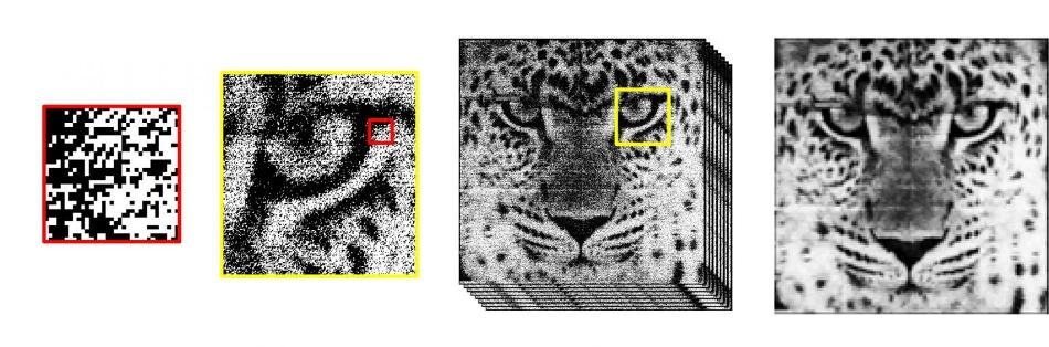 This is a sample photo taken with the 1 Megapixel Quanta Image Sensor operating at 1,040 frames per second, with total power consumption as low as 17 mW. It is a binary single-photon image, so if the pixel was hit by one or more photons, it is white; if not, it is black. Figure 4 shows how an image in grayscale was created by summing up eight frames of binary images taken continuously. This process is where the innovative image processing of the QIS can be applied. CREDIT: Jiaju Ma