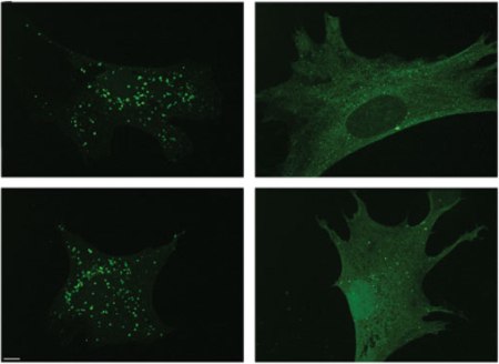To determine if the enzyme RagA plays a role in triggering autophagy, a protein involved in autophagy has been tagged green in these embryonic mouse skin cells. (Courtesy of Nature)